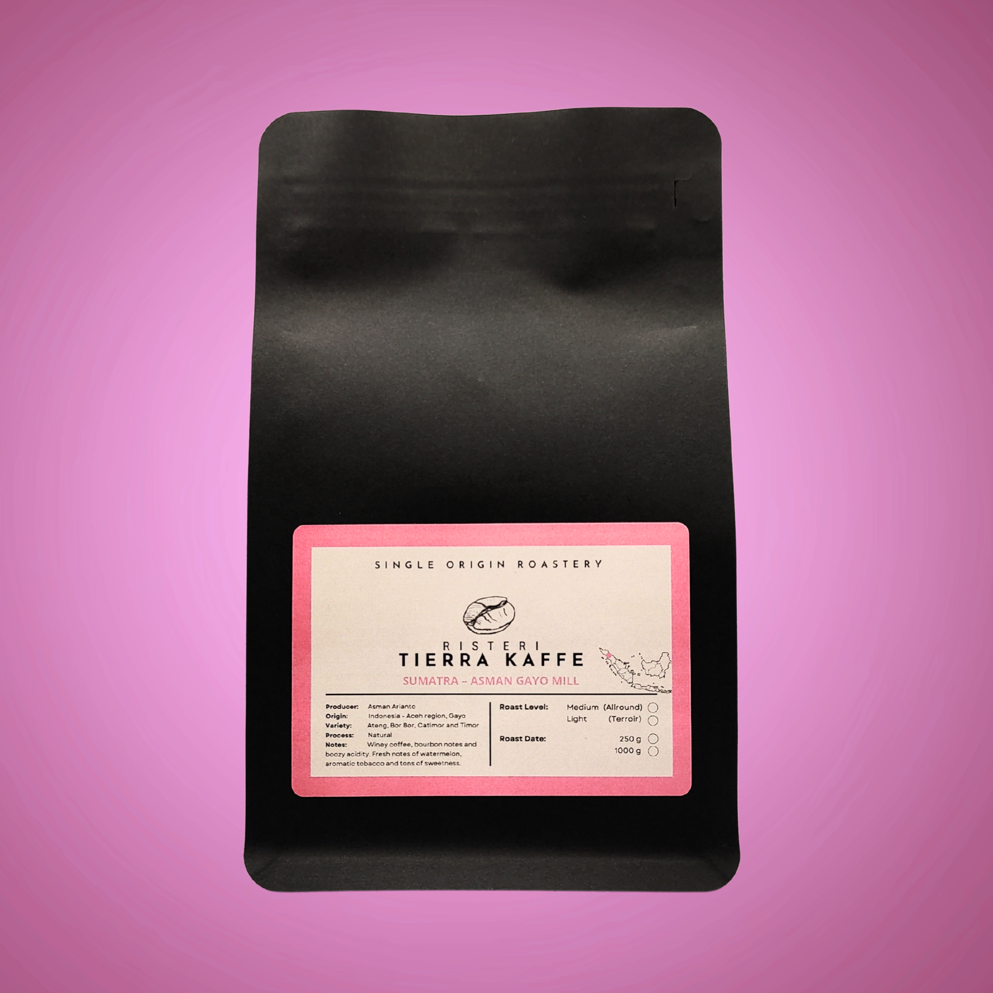 Denne natural-kaffe kommer fra den kendte Aceh-provins i det nordligste Sumatra (Indonesien), mere specifikt Pegasing-distriktet. Asman Gayo Mill er en micromill drevet af Asman Arianto, der har vundet Cup of Excellence. Den fungerer som fælles anlæg for flere små kaffeproducenter fra Pantan Musara-området og har desuden bidraget til at få producenterne på fode igen, efter at de fleste af dem mistede deres hjem og tidligere farme i en tsunami. Med hjælp fra Asman Gayo Mill har de nu fokus på kaffe, som de dyrker i dette meget diverse område, der både har strande, bjerge, vulkansk jord og regnskov.